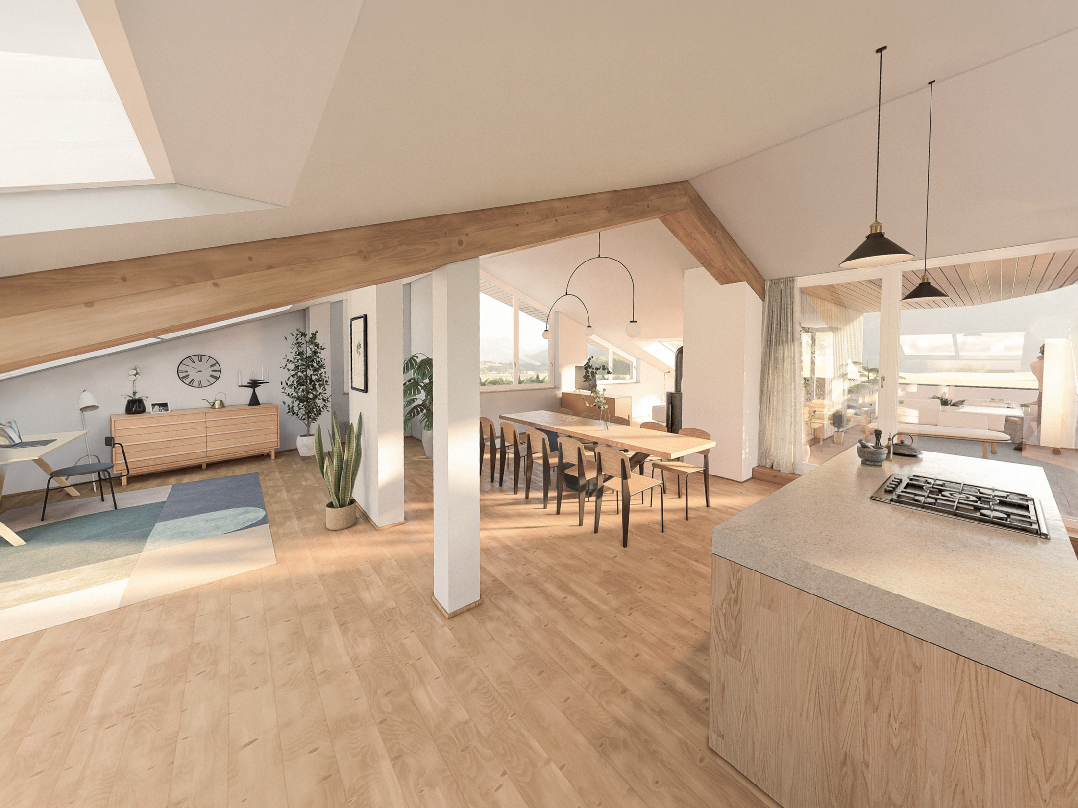 Im Obergeschoss wartet eine 45 m² Wohnung, ideal für Singles oder Paare, mit offenem Wohn- und Essbereich, einem Schlafzimmer und Balkon mit Bergblick.